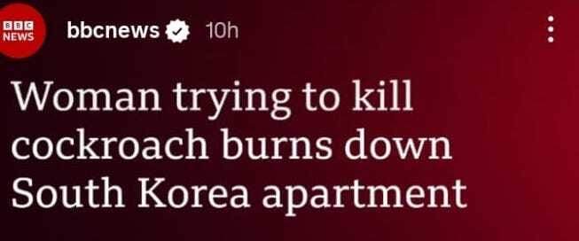 When I saw this on my feeds, I took a screenshot because I knew I wanted to share it with you as a funny story. āSounds appropriate!ā would be my caption, or something like that. But then I did something rather unusual for todayās online habits: I actually read the article. And let me tell you: itās not funny at all. This woman used a lighter and flammable spray to try and kill the cockroach. As a result, some of her furniture caught fire, and this spread to the whole apartment block. Her direct neighbours tried to escape through a window. The husband went first to an adjacent balcony, the mother passed him their two month old baby (!!), and the mother tried to make it across. She slipped, fellā¦and died. Itās a horrendous story, and the headline doesnāt seem appropriate at all. š¢