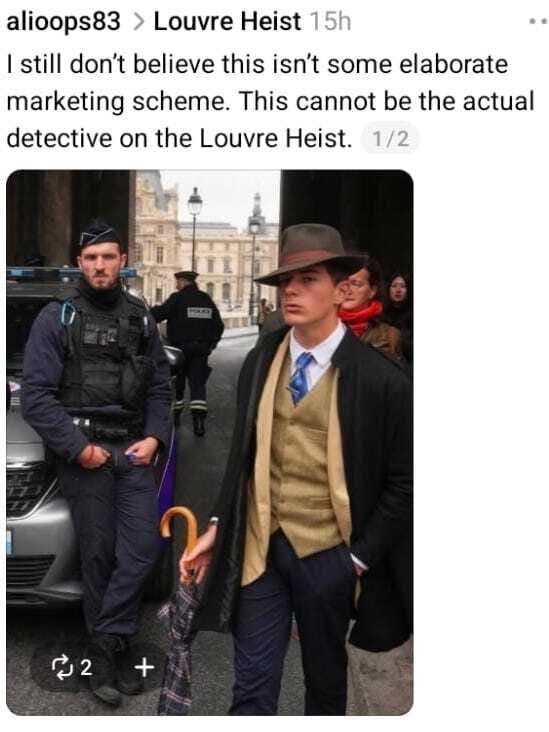 Conversely, the Louvre heist story is hilarious. We are all rooting for the thieves, arenāt we? And I do believe this is a genuine, real photo of the detective on the case. Gotta love it!