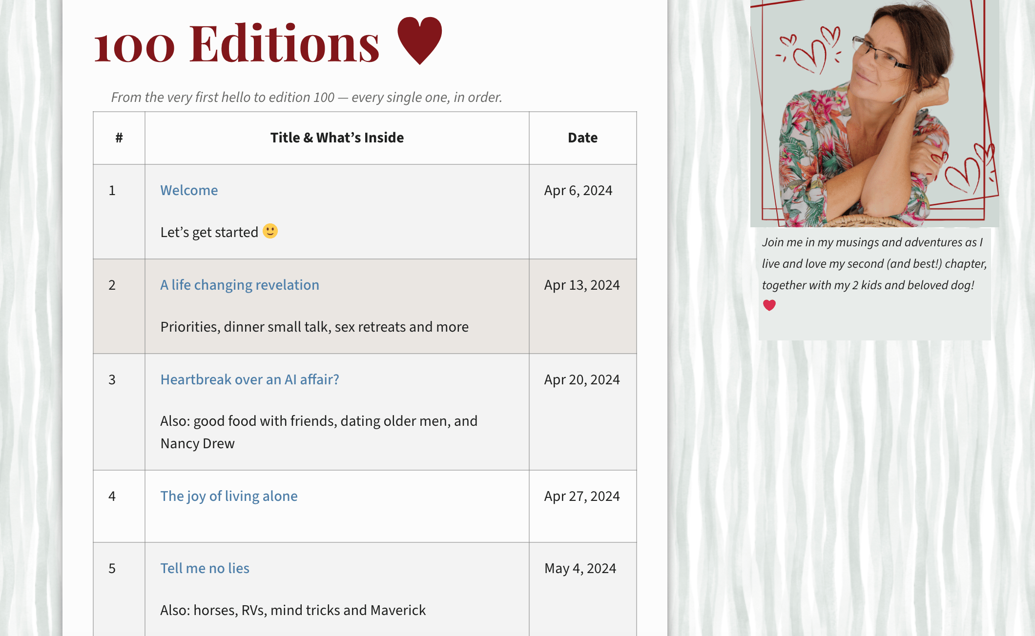 100 newsletters! About 200,000 words! Equal to 2.5 books! To mark the occasion, my website now has a single page with links to all the past editions, should youā¦.ever be very bored? Can we talk about how I made this Table of Contents? I could have copied each of the 100 titles and blurbs from their individual pages, pasted them into a document, added the hyperlink, and then formatted each entry individually. Or, I could have asked Claude to do it for me. And he (yes, itās a personified he) could do it in 30 seconds flat. No brainer as to which option I chose. This was a genuine saving of hours. More specifically, it was a genuine creation of content that would otherwise not exist because I would never have taken the time to do it. So although I have never used AI to write anything that I have published, I do most definitely use it behind the scenes to do tasks like this (and lots and lots of other, much more clever stuff too). But thatās not for this newsletter, or this blog (hint! hint! re other things I am working on :-) ). Here is the ToC.